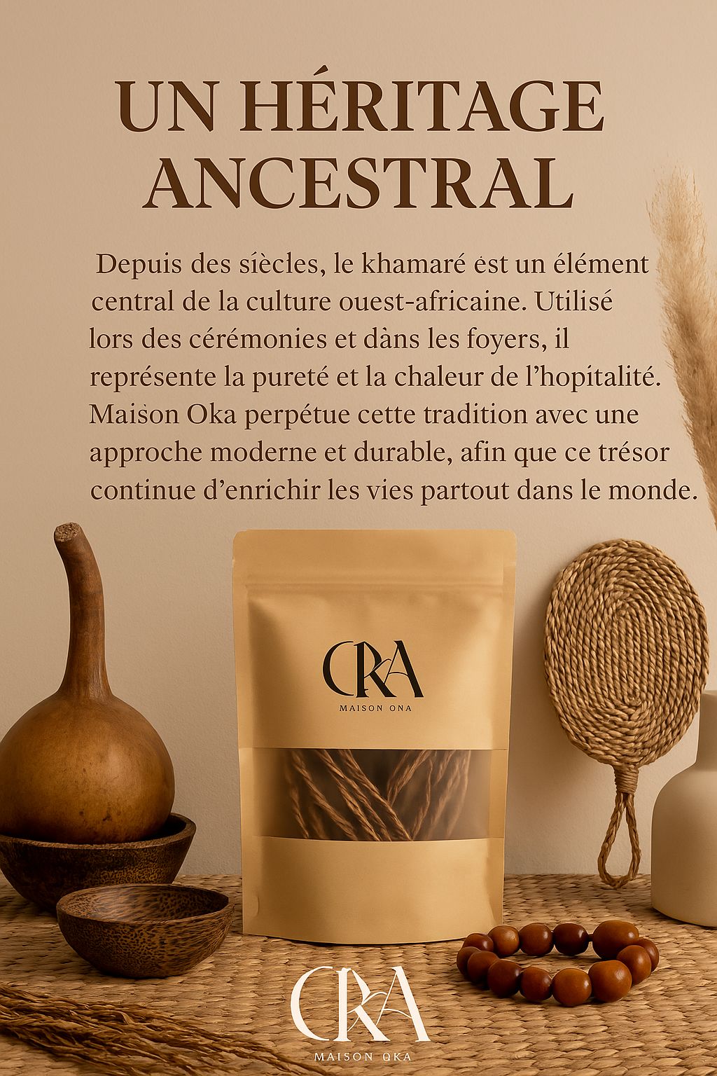 Maison Oka est née d’un profond respect pour la nature et les traditions. Nous vous proposons du khamare, ou vétiver, soigneusement récolté en Mauritanie, un produit naturel riche de bienfaits pour le corps et l’esprit. Chez Maison Oka, nous croyons en la pureté, la qualité et la durabilité. Chaque brin de khamare raconte une histoire à la fois ancienne et intemporelle.